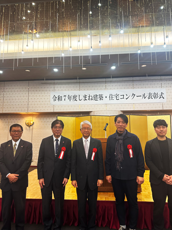 河原泰建築研究所と共同でプロポーザルに参加したのが2020年、増改築工事をして2024年に竣工したやすぎ博愛クリニックが令和7年度しまね建築・住宅コンクールにて優秀賞を頂きました。関係者の皆様や地域の方々に支えられての賞と思っています。関わることができた事、大変感謝申し上げます。